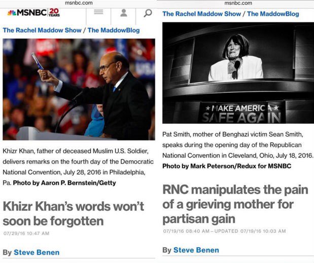 First, he disparages the mother of a fallen soldier by suggesting that she let her husband speak at the DNC because she is a Muslim woman. (Yo Donald, guess who else watches her husband speak while standing at his side without saying a word?) And then he claims that the brave soldier's father "viciously attacked" him for simply speaking his mind.